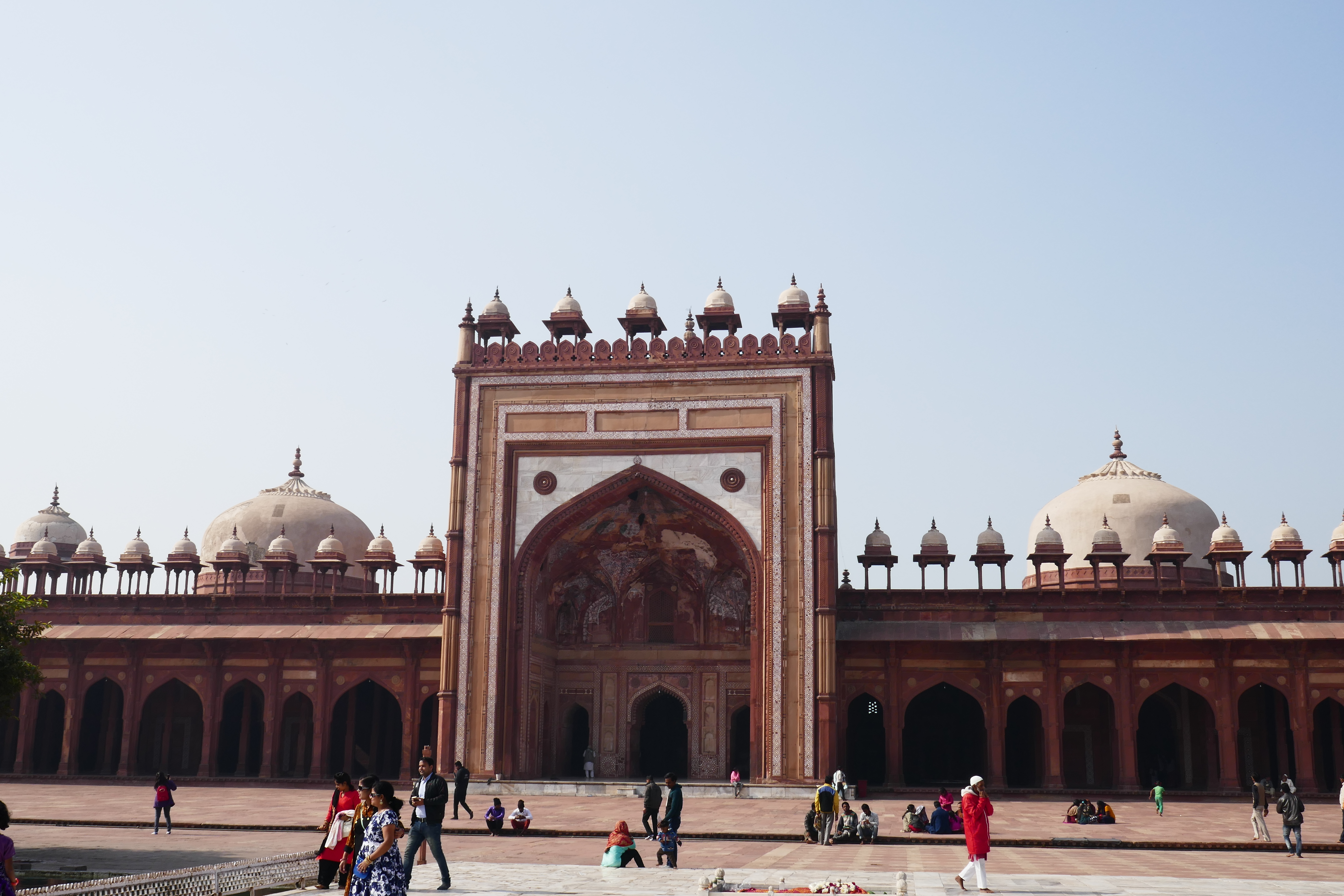 Kaum hatten wir den Innenhof der Moschee betreten, richteten sich alle Blicke auf uns. Handys wurden gezückt und Fotos gemacht. Dann kamen die ersten Mutigen und fragten nach Selfies mit uns. Wir wollten nett sein, stimmten zu und ehe wir uns versahen, waren wir von Menschen umzingelt, die uns anfassten oder sogar ihre Babys auf den Arm drückten. So fühlt man sich also als Promi. Vipin kam uns irgendwann zur Hilfe, bändigte die Meute und empfahl uns solche Anfragen abzulehnen, da wir sonst selbst keine Zeit mehr hätten, die Sehenswürdigkeiten anzusehen. Indien ist bei Weitem nicht so touristisch, wie man denkt bzw. handelt es sich überwiegend um indische Touristen, die zum Teil aus kleinen Dörfern kommen und noch nie Menschen mit heller Hautfarbe gesehen haben. An dieser Stelle sei schon mal gesagt, dass wir auf der gesamten Reise immer wieder angestarrt und um Fotos gebeten wurden, was wir je nach Situation doch auch zuließen. Außerdem winkten alle vom Straßenrand unserem Bus zu, als wären wir die Queen bei einer Parade in London.