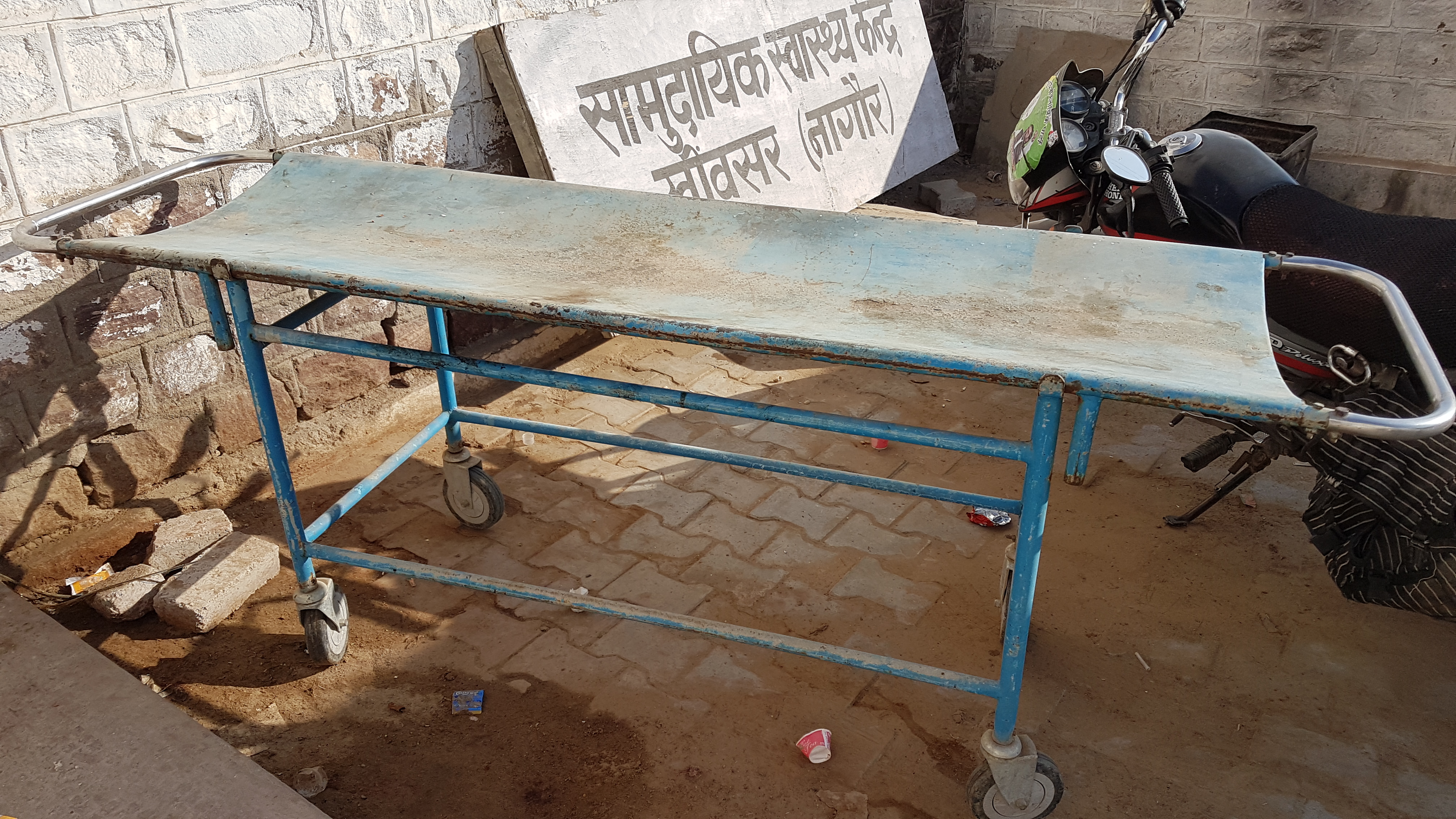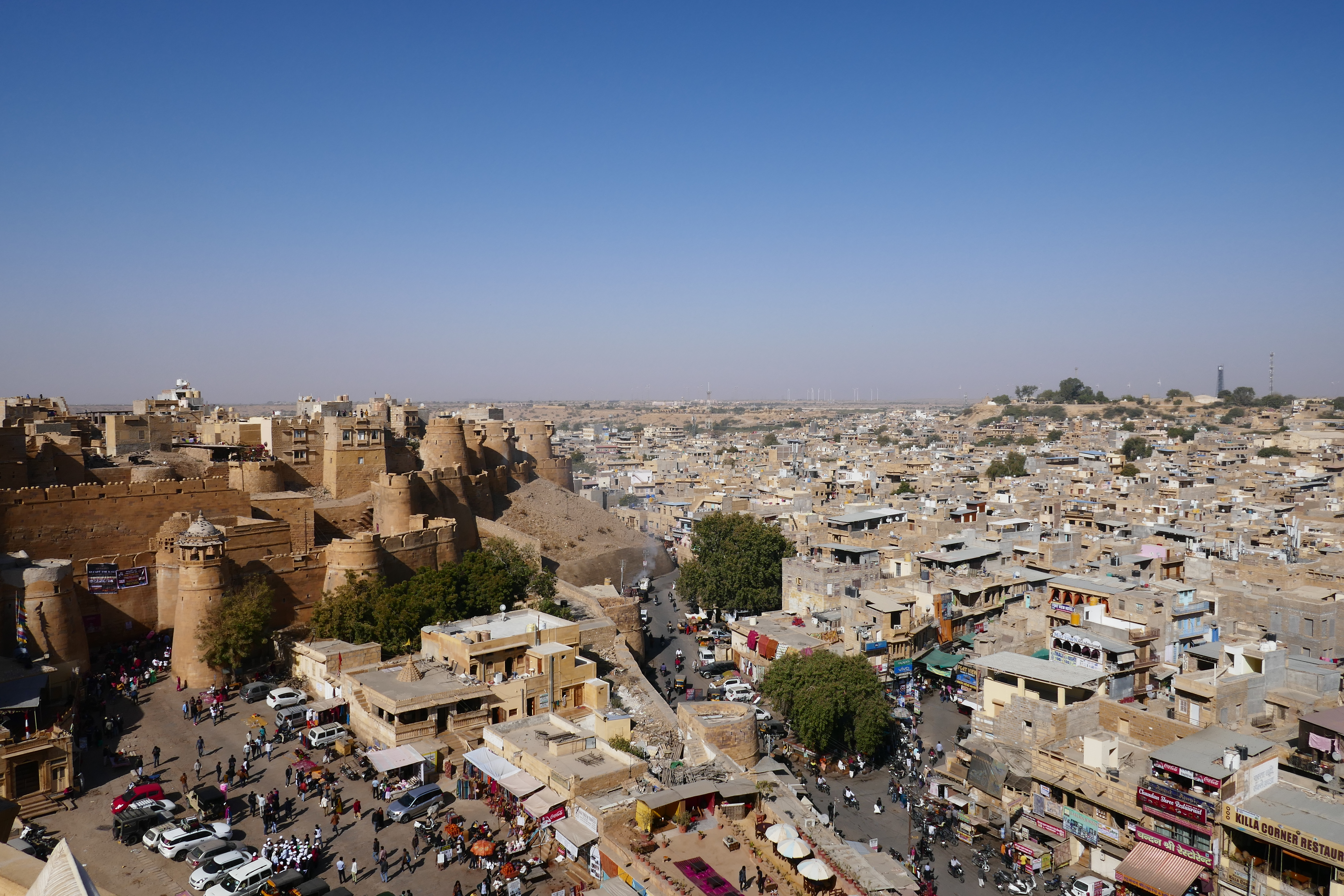 Meine Freundin hatte schon einige Tage zuvor morgens Kreislaufprobleme gehabt, aber jetzt bekam sie über Nacht Darmprobleme, wovor in Indien immer gewarnt wird. Wir hatten nie ungeschältes Obst, Salat oder Eiswürfel bestellt, aber die Nudeln hatten eine Sahnesauce gehabt, was möglicherweise den Ausschlag gegeben hatte. Da es ihr wirklich nicht gut ging und wir weiter nach Jaisalmer fahren mussten, machten wir Halt am städtischen Krankenhaus. Was man hier darunter versteht, kann man sich als Europäer nicht vorstellen, wenn man es nicht selbst erlebt hat. Was wie ein Haus kurz vorm Abriss aussah, war tatsächlich ein Krankenhaus. Diagnosemethode war bei allen Patienten Blutdruck messen mit einem Gerät wie aus dem Mittelalter. Dabei saßen drei Inder um einen Tisch herum, sodass gar nicht klar war, wer überhaupt der Arzt war und die Patienten befanden sich auch alle gleichzeitig mit im Raum. Dann wurden Medikamente verschrieben, die man am Kiosk auf der gegenüberliegenden Straßenseite kaufen konnte. Und ab ging die Fahrt nach Jaisalmer.