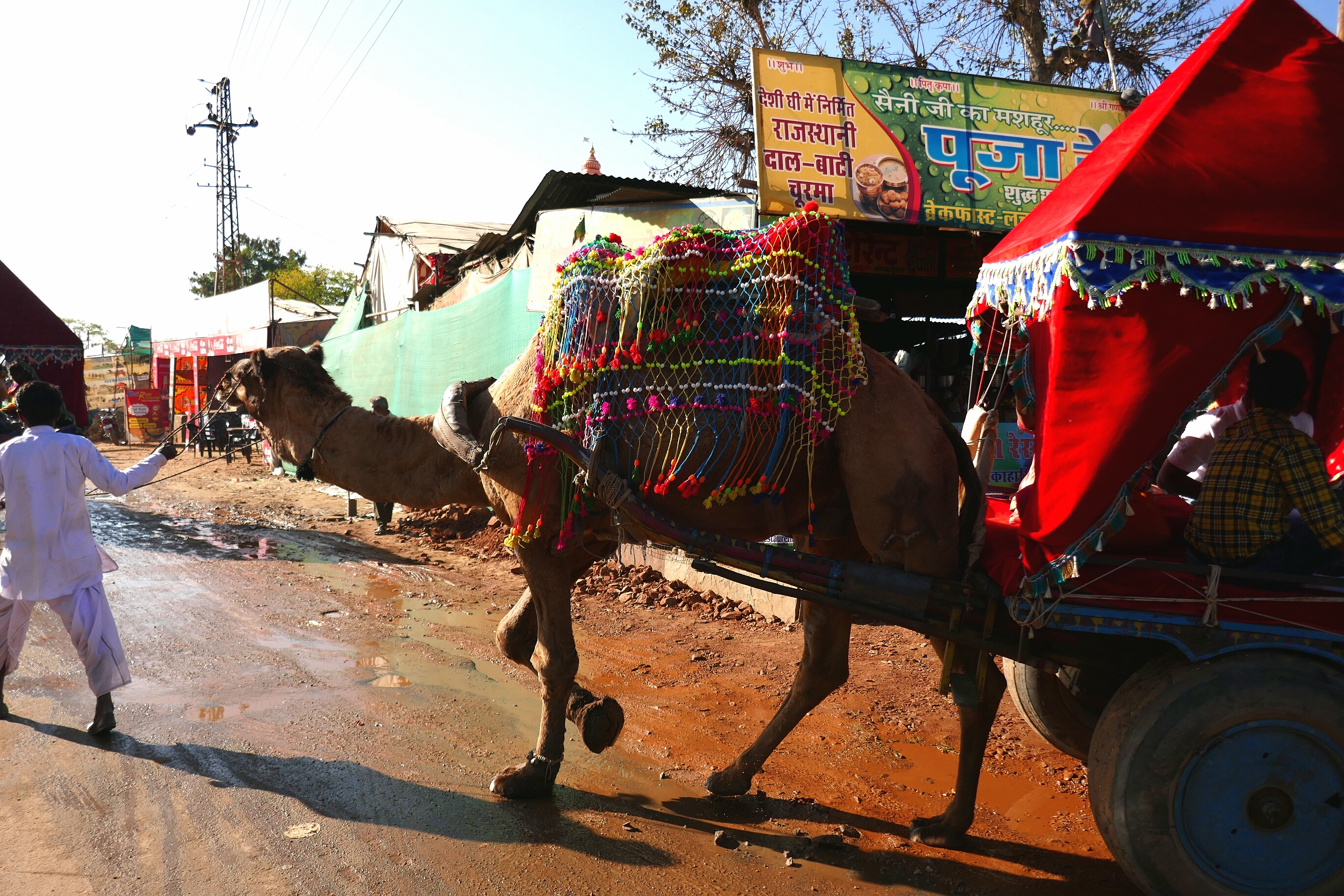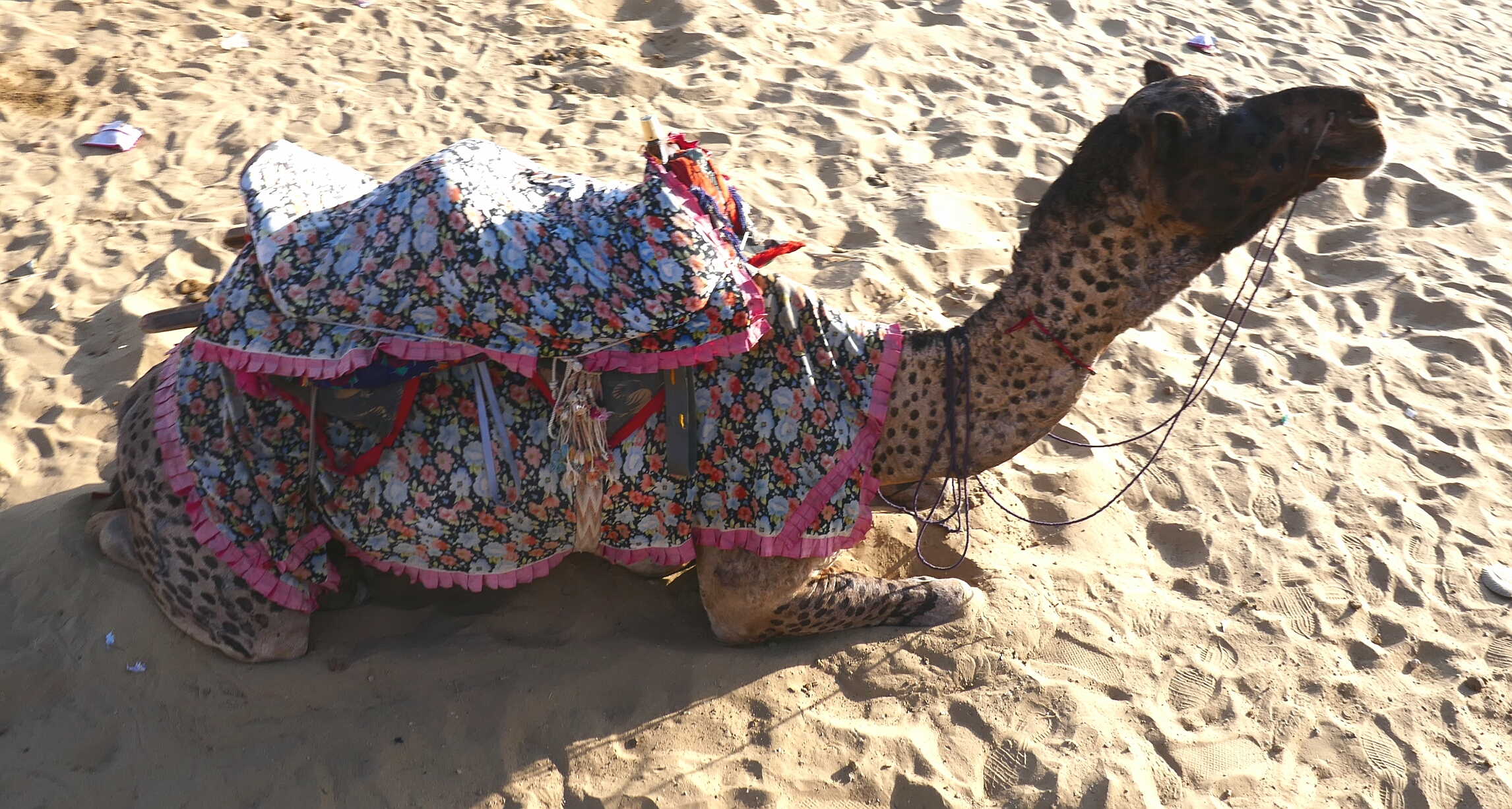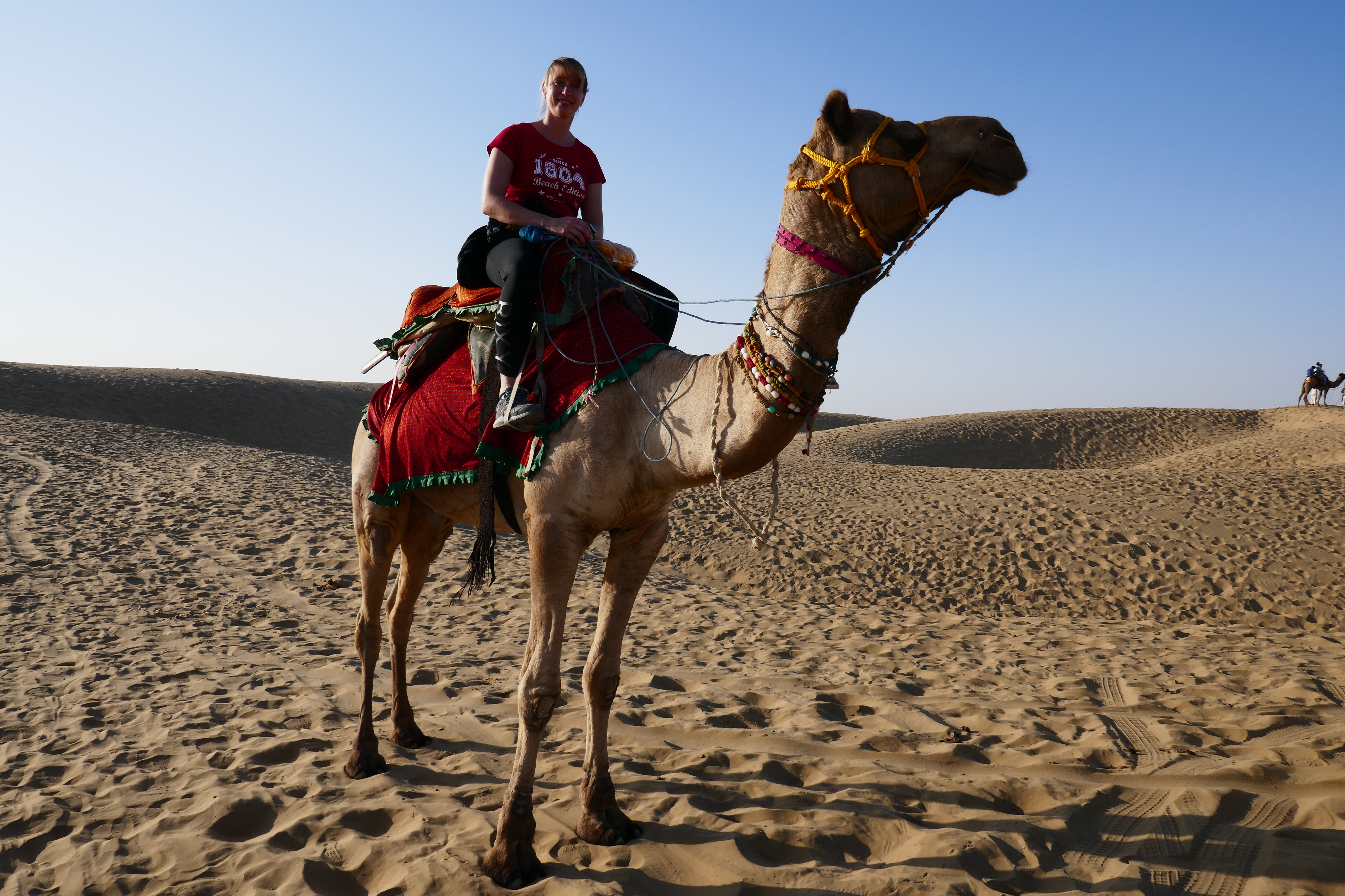 Wer bei einem Kamelritt in Jaisalmer an weite Wüste und Einsamkeit denkt, liegt völlig falsch. Für Übernachtungsgäste waren riesige Zeltstädte errichtet worden. Hunderte von Kamelführern zogen ihre Tier samt Touristen durch die Dünen. Schnell wurden uns ein paar Kamle zugewiesen. Eigentlich sind es Dromedare, aber in vielen Ländern sagt man auch bei einem Höcker Kamel. Anstatt der geplanten halben Stunde war der Ritt nach 20 Minuten beendet. Immerhin durfte man bei Nachfrage auch selbst die Zügel in die Hand nehmen und mal eine etwas schnellere Gangart ausprobieren.