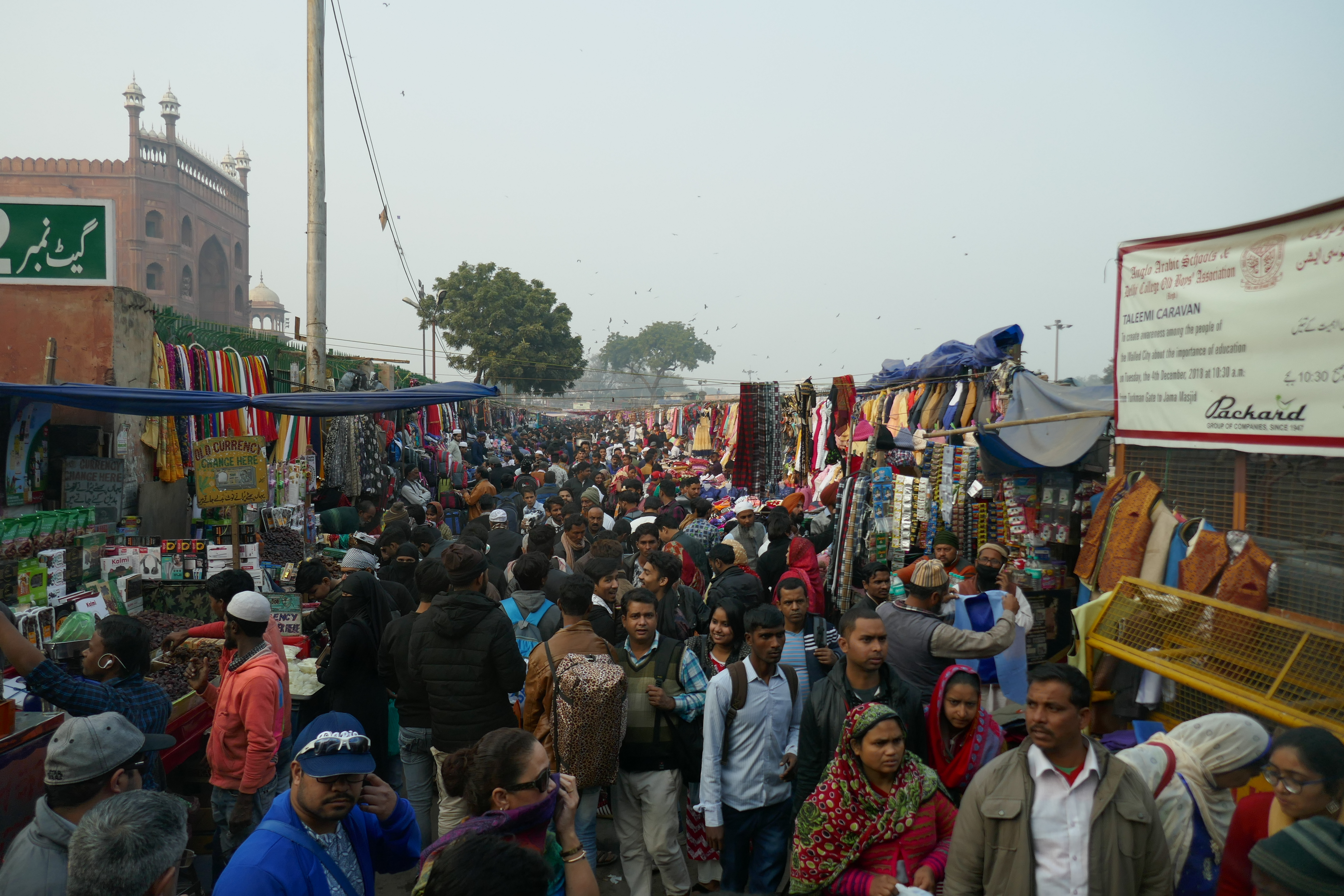 Nachdem alle ca. 8000 Rupien (100 €) abgehoben hatten, fuhren wir gegen 11 Uhr zu unserem Hotel, das etwas außerhalb der Stadt lag, um uns frisch zu machen. Dann begann das Tagesprogramm. Zunächst besuchten wir die Jama Masjid Moschee in Old Delhi. Früh zeichnete sich ab, dass unser Reiseführer selten einen Überblick über die Tagesabläufe sowie mitzunehmendes Gepäck gab. So sagte er häufig, dass eine Kamera ausreiche. Unerwartet mussten wir dann für die Nutzung derselben zahlen, ohne Geld mitzuhaben. Dies führte zunächst zur Verwirrung, aber Vipin übernahm die Kosten an der Moschee. Frauen mussten sich trotz langer Kleidung ein gelbes Gewand umhängen und alle mussten die Schuhe ausziehen, was auch bei allen weiteren religiösen Stätten der Reise der Fall war.