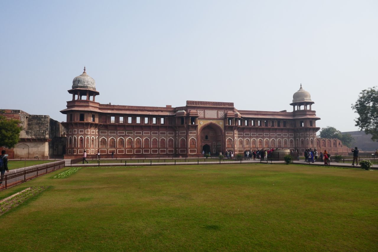 Nach dem Mittagessen ging es weiter zum Agra Fort. Wirkt es zunächst noch unscheinbar, zeigt es erst im hinteren Teil seine ganze Pracht. Von hier aus hat man auch eine Blick auf ds Taj Mahal. Im Fort gab es außerdem Affen und jede Menge Streifenhörnchen zu sehen. Aber Vorsicht: Wenn jemand mit Futter eines der Tiere anlockt und euch auf die Hand setzt, macht er das nicht ohne Hintergedanken. Die Inder sind sehr kreativ, wenn es ums Geld verdienen geht. Schreitet jemand mit prächtigem Turban umher, dass es nur so nach „fotografier mich“ schreit, wird auch diese Person Geld verlangen. Toilettenfrauen, die einem so nett, wie auch unnötig die Papiertücher reichen, sollte man dennoch mit 10 Rupien entlohnen.