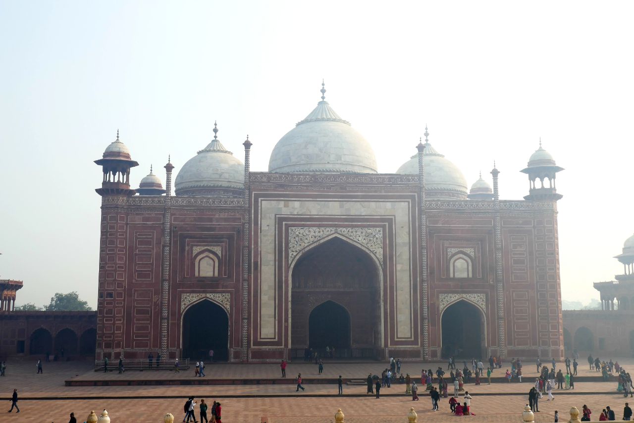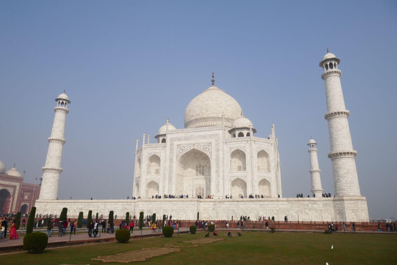Tag drei begann schon um 8 Uhr. Wir machten uns auf den Weg zum Taj Mahal in Agra. Eigentlich war dies für den Sonnenaufgang vorgesehen, aber unser Reiseleiter überzeugte uns, dass man bei dem Nebel oder auch Smog nicht viel sehen werde. Als wir ankamen, stellte sich schnell heraus, dass dies die richtige Entscheidung war. Das imposante Gebäude war in einen grauen Dunst gehüllt. Da wir uns aber recht lange dort aufhielten, konnten wir noch Fotos bei klarem Himmel machen und natürlich Selfies mit Indern. Wenn man übrigens im Gegenzug bittet auch ein Foto mit ihnen machen zu dürfen, sind viele sehr zögerlich. Auf der anderen Seite haben wir auch eine gewisse Dreistigkeit bei einigen feststellen können, die sich einfach, ohne zu fragen, neben einen gestellt und abgedrückt haben.