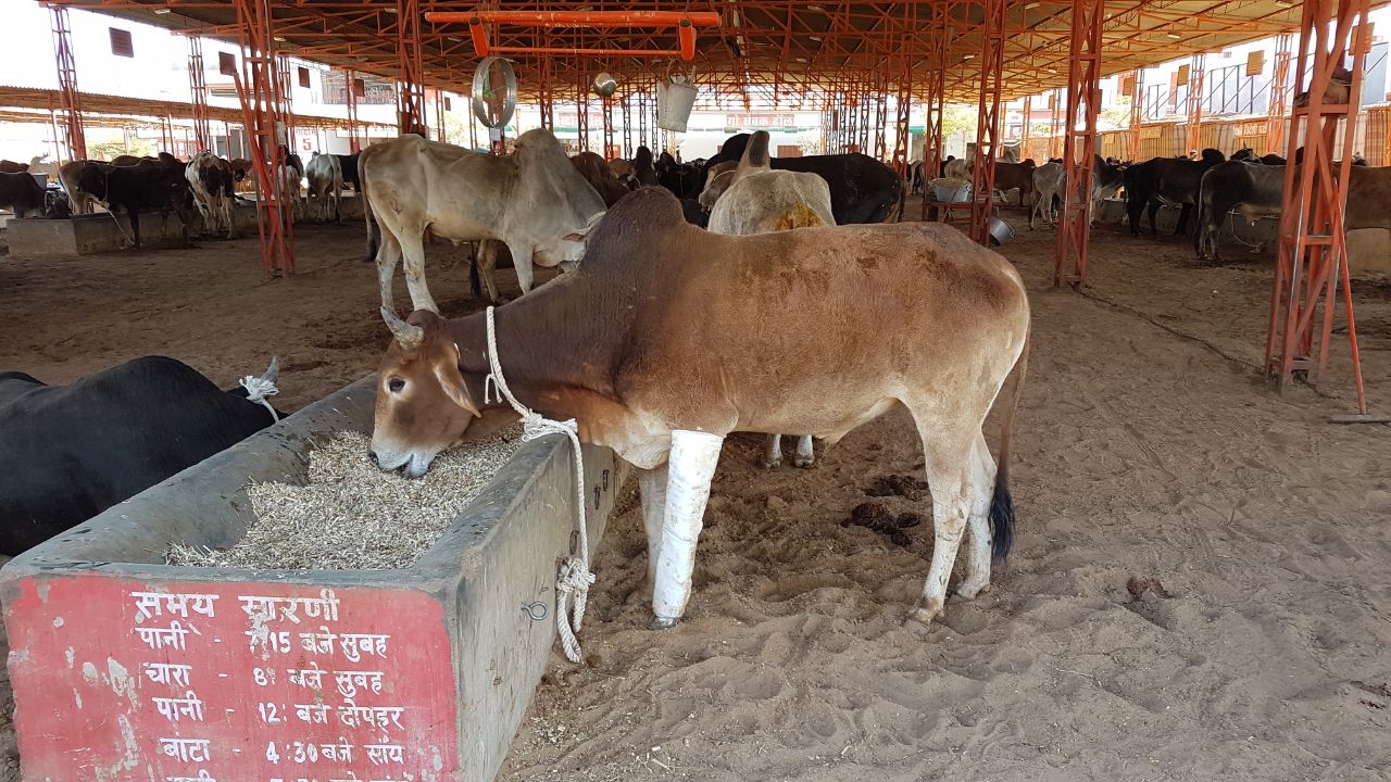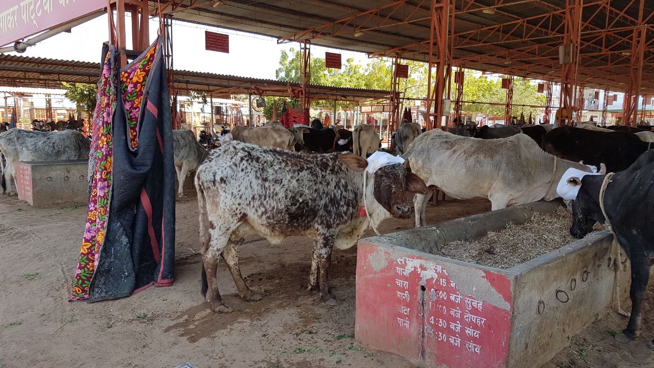 Am Samstag mussten wir von dem schönen Hotel schon wieder Abschied nehmen und fuhren nach Khimsar. Auf dem Weg hielten wir an einem Kuhkrankenhaus. Über 1000 Patienten mit verschiedenen Verletzungen von Brandwunden bis zu abgtrennten Gliedmaßen werden hier auf der Grundlage von Spenden behandelt. Besitzer müssen nichts bezahlen. Ungefähr 60 Ambulanzen bringen die Tiere her. Auch Vögel, Ziegen, Antilopen etc. werden aufgenommen. Die Hindus haben ein sehr gutes Verhältnis zu Tieren. Überall sieht man Kühe, Schweine, Affen und Hunde auf der Straße. Autofahrer fahren vorsichtig rundherum. Wer eine Kuh tötet muss Strafe bezahlen. Obwohl die Tiere zum Teil gefüttert werden, findet man sie oft auf Müllbergen irgendwelchen Unrat fressen. Daher gibt es auch Kühe in dem Krankenhaus, bei denen Plastikmüll aus dem Magen geholt wurde. Wer schon mal in Asien war, weiß, dass es mehr als genug Müll an den Straßenrändern gibt.