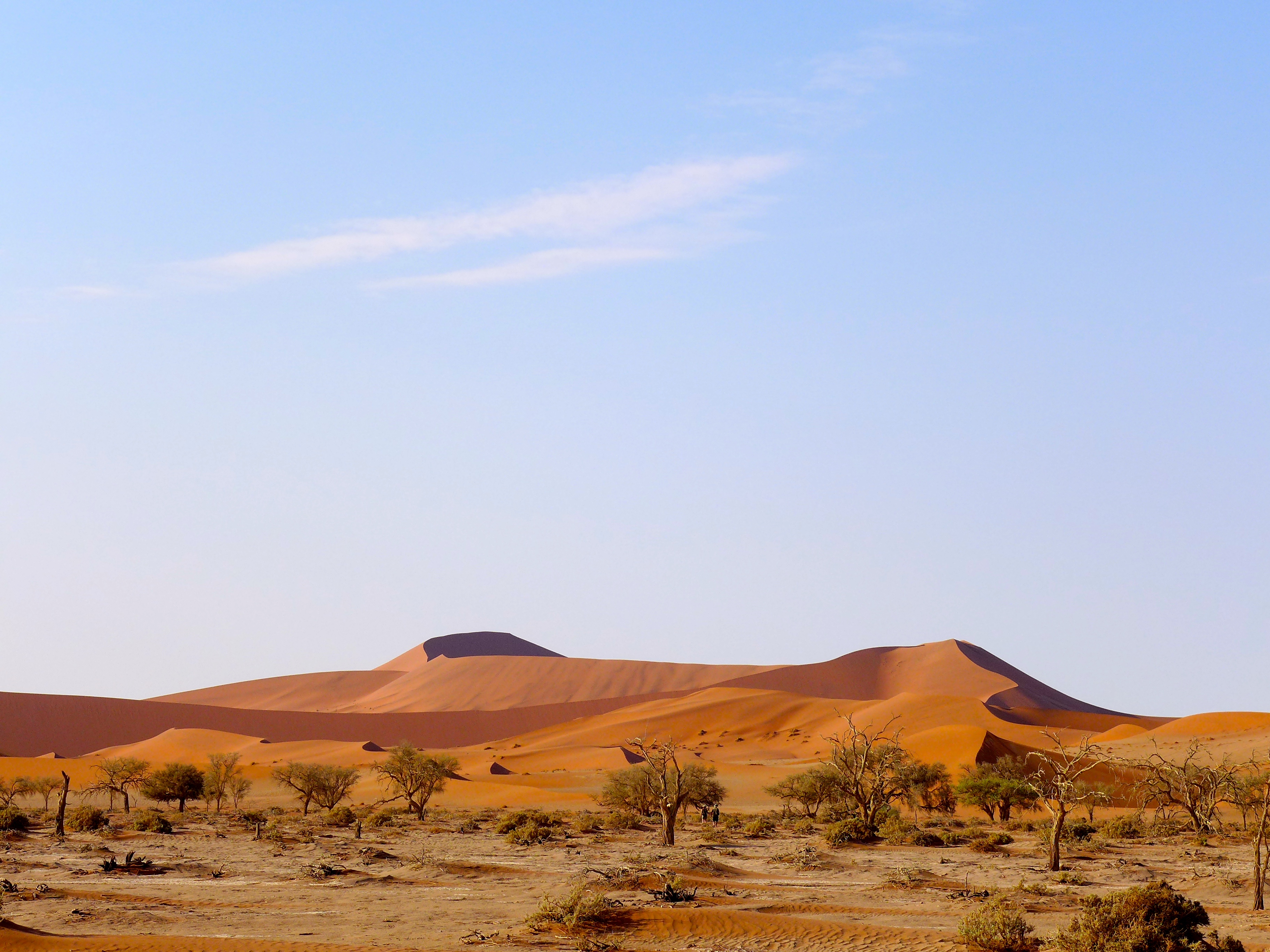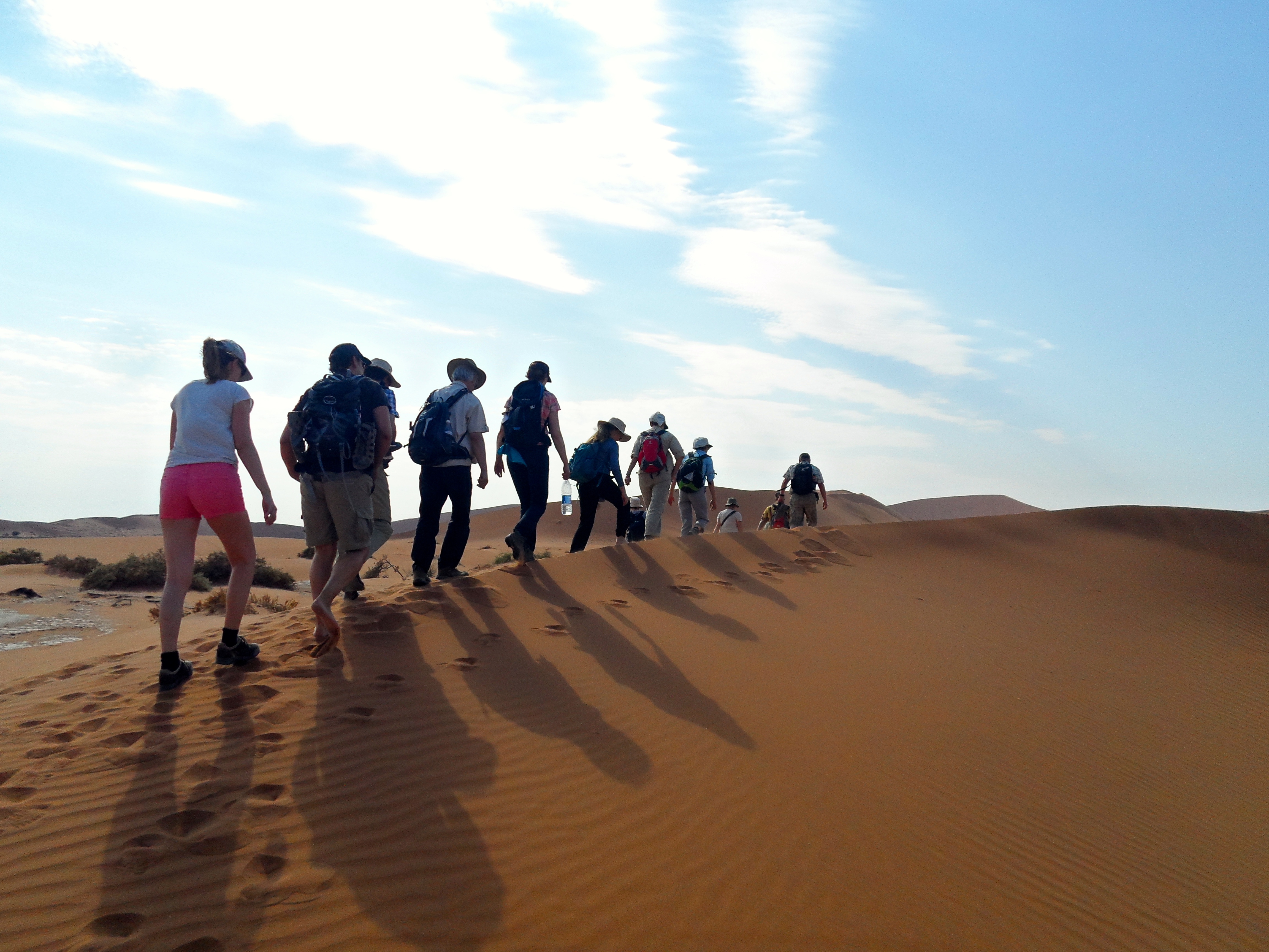 Der Freitag wurde dann richtig anstrengend. Um 5 Uhr war Abfahrt Richtung Namib-Wüste. Gefrühstückt wurde an einer Tankstelle. Dann wurde über die Dünen gewandert bis zur weißen Pfanne des Sossusvlei. Vier Stunden haben wir uns bei ca. 40 Grad dort aufgehalten.